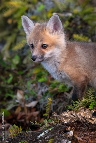 Close up of a red fox kit standing on a log surrounded by ferns.