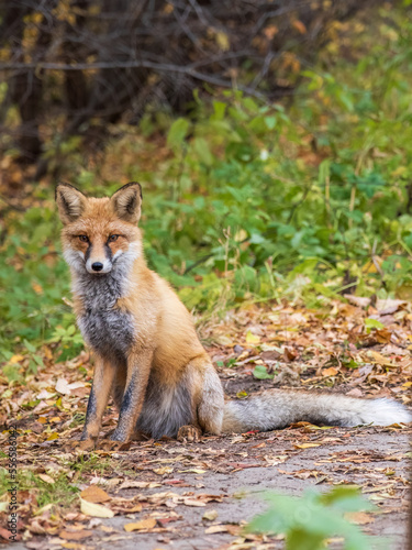 Close up of a red fox Vulpes vulpes, sitting on a path in the forest.