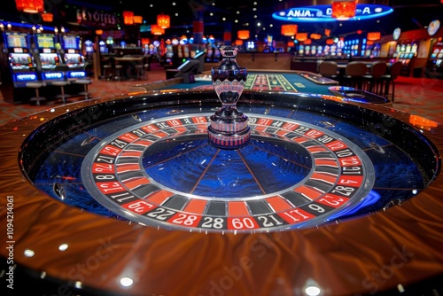 Close up of a roulette wheel surrounded by bright casino lights and colorful slot machines