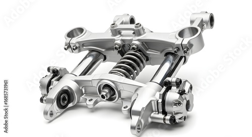 Close up of a silver motorcycle front suspension with spring and bolts on a white background studio shot