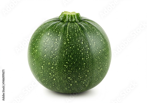 Close up of a single round zucchini with white spots on a white background in a studio setting