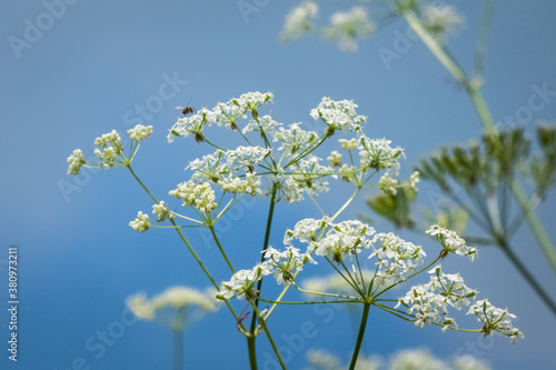 Close up of a small hornet sitting on wild cow parsley plant. White natural flower on blue sky background.