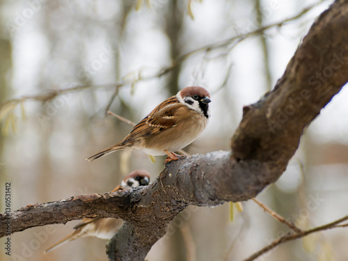 Close up of a sparrow sitting on a tree branch in winter in a park. Wildlife, Birds