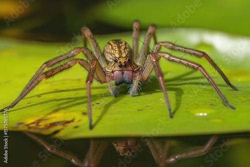 Close up of a spider on a green leaf with its reflection visible in the water below the leaf surface