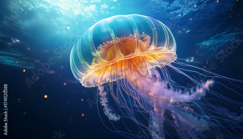 close up of a transparent jellyfish with flowing tentacles in deep blue ocean water with small glowing particles