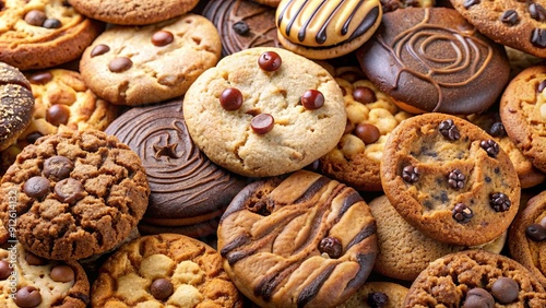 Close up of a variety of delicious cookies , assorted, baked goods, treats, dessert, sweet, snack, chocolate chip