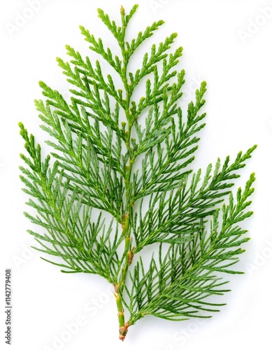 Close up of a vibrant green cypress branch, showcasing its delicate, feathery needles against a pristine white backdrop