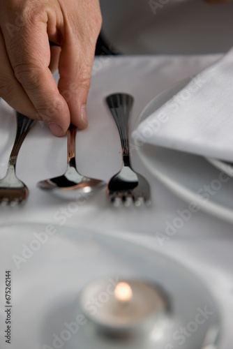 Close up of a waiter hand arranging cutlery on a restaurant table