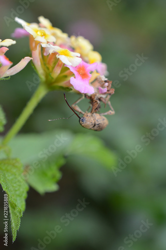 Close up of a weevil on a pink wild flowers outside on a sunny day against a green background