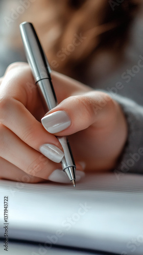 Close Up of a Woman Hand Writing on Paper with Silver Pen in Gray Tones