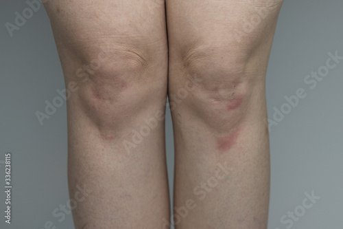 Close up of a woman standing facing the camera against a gray background, exposing the front of her knees with pale skin, freckles, redness, and bruising