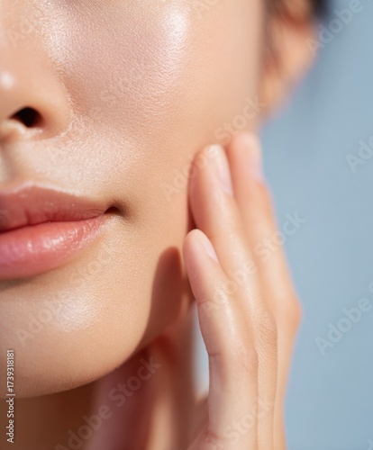 Close up of a woman touching her smooth skin against a soft blue background in natural light