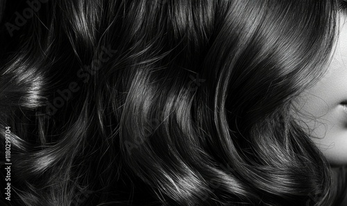Close up of a woman's hair with a black and white filter. The hair is long and curly, and the woman's face is barely visible.