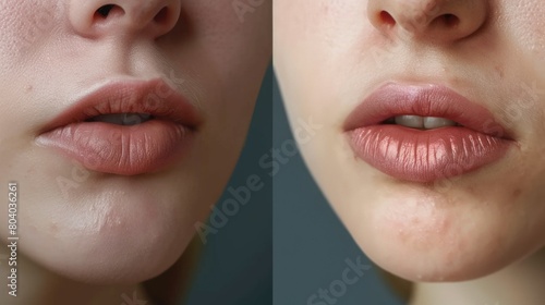 Close up of a woman's lips showing the transformation after treatment. Suitable for beauty and cosmetic concepts