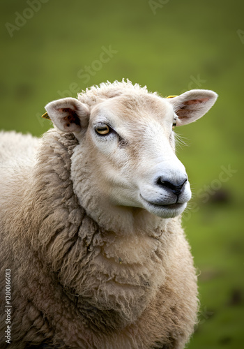 Close up of a woolly sheep standing in a green pasture with blurred background