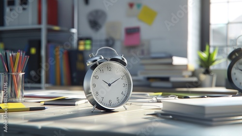 Close up of alarm clock on forefront with entrepreneur work on laptop in office on background, working process