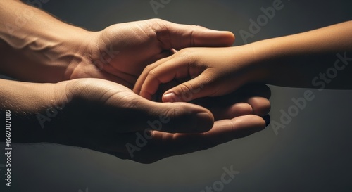 Close up of an adult hand gently cradling a child hand, symbolizing care, protection, and family bond
