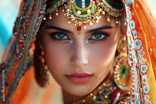 Close up of an attractive girl in a traditional Indian bridal outfit with elaborate jewelry and makeup