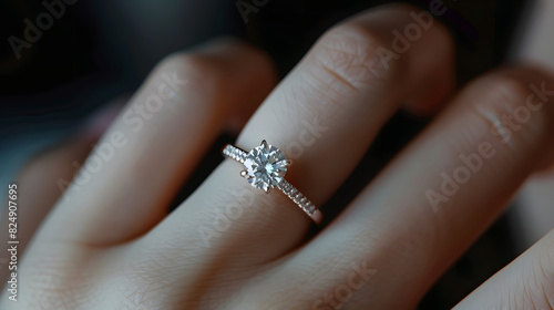 Close up of an elegant engagement diamond ring on woman finger. love and wedding concept. Diamond ring on young lady's hand on dark background.