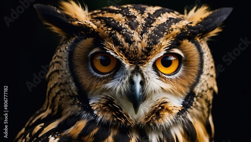 Close up of an intense owl with striking orange eyes
