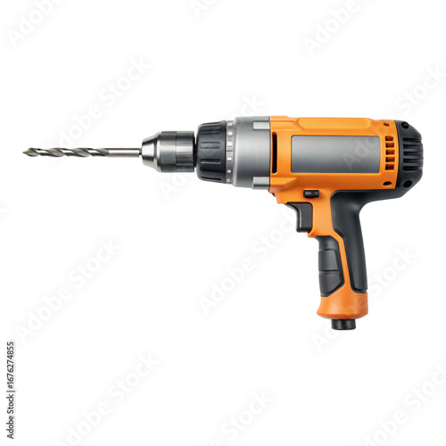 Close up of an orange and gray power drill with a drill bit against a black background studio shot created with generated ai