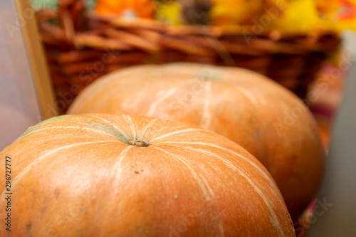 Close up of an orange seasonal pumpkin for fall or autumn time ready for decoration for Thanksgiving, Halloween and Fall festive fun.