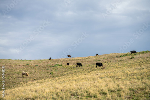 Close up of Angus and Murray Grey Cows eating pasture in Australia.