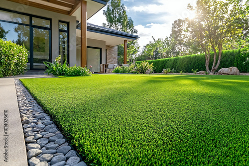 Close up of artificial grass lawn. Synthetic grass front yard - modern house. Artificial lawn.