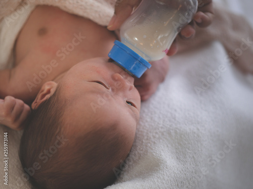 Close up of Asian female newborn baby lying in bed and Suck milk Bottle in home with sunlight in the morning. Cute little girl three weeks old. Baby health concept