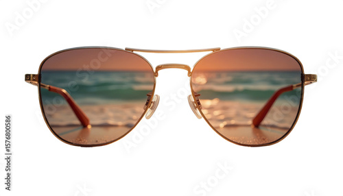 Close up of aviator sunglasses with ocean and sunset view in the background