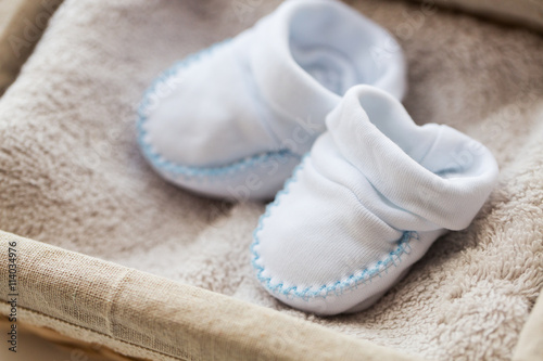 close up of baby bootees for newborn boy in basket