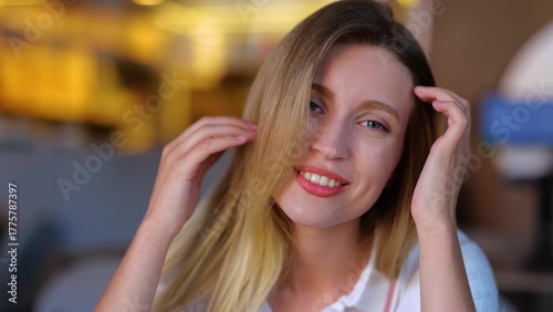 Close up of beautiful cheerful female sitting in restaurant and flirting talking to camera. Caucasian happy young blonde woman on a date looking at camera smiling. Flirt concept