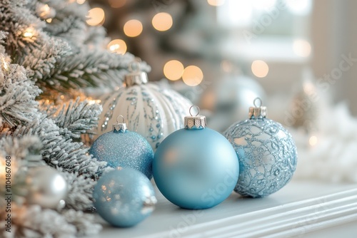 Close up of blue and white Christmas ornaments on a white mantle with a Christmas tree in the background.