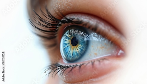 Close up of blue human eye with detailed iris. Reflection of bright light, faint grid pattern visible in pupil. Eyelashes, skin texture clearly defined. Focus on iris intricate structures,
