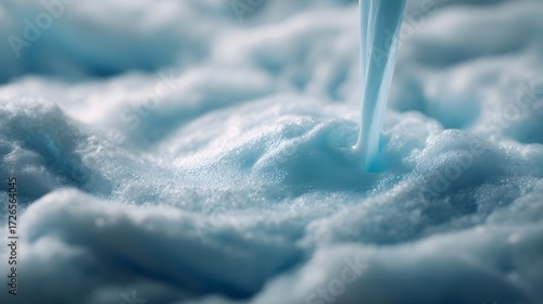 Close up of blue liquid pouring into soft white foam creating ripples and bubbles