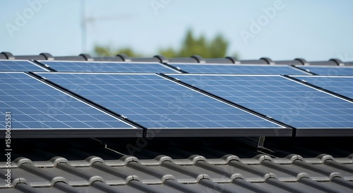 Close up of blue solar panels installed on a dark grey tiled roof energy electricity