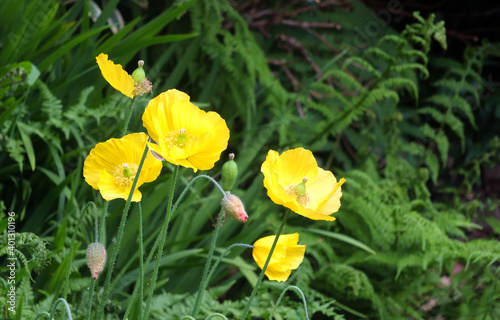 close up of bright yellow welsh poppy flowers with sunlit green vegetation against a blurred green background