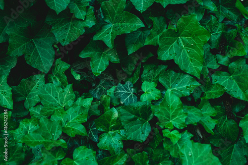 Close up of bush leaves with dew drops. Green background from wet leaves. Background for a poster about ecology