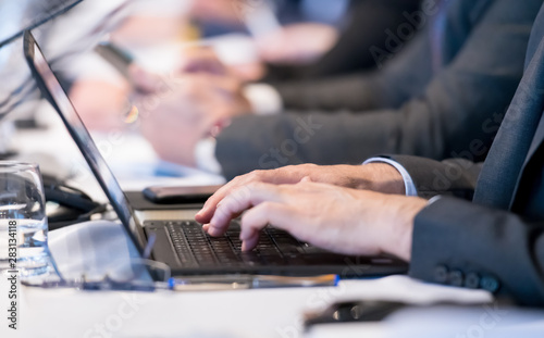 close up of business people hands using laptop computer