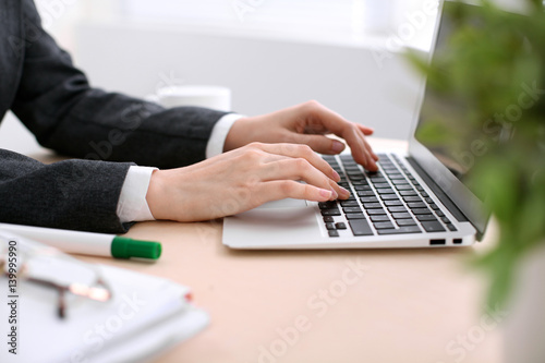 Close up of business woman hands typing on laptop computer in the white colored office.