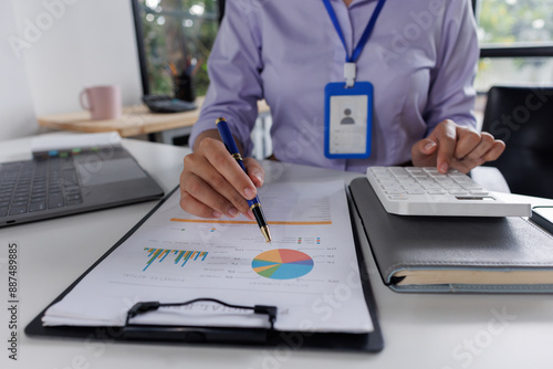 Close up of business woman or accountant hand holding pen working on calculator to calculate business data, accountancy document and laptop computer at office, business concept