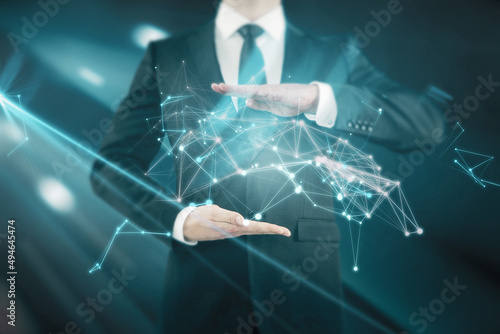 Close up of businessman hands holding abstract creative polygonal network on blurry background. Metaverse, technology and science concept. Double exposure.