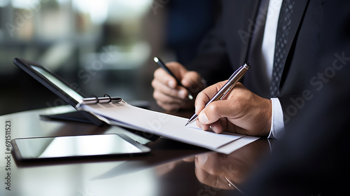 Close up of businessman hands holding pen and writing on paper report at desk in modern coworking office, business man signing contract making a deal