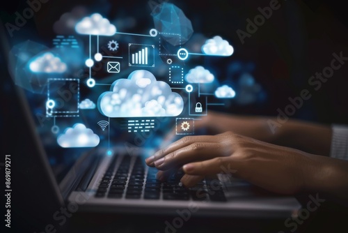 Close up of businessman hands typing on laptop keyboard with cloud technology icons floating above, indicating the use of AI for data analysis and marketing