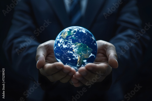 Close up of businessman holding digital globe in palms on dark background -
