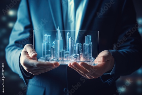 Close up of businessman holding hologram of a modern city model in palm. Holographic city model, virtual reality, augmented reality. Generative AI.