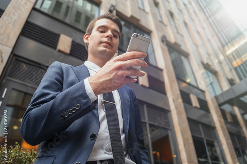 Close up of businessman next to skyscraper looking at screen of mobile phone.