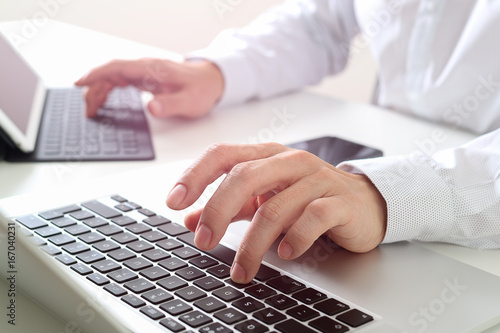 close up of businessman typing digital tablet with keyboard and laptop computer on white desk in modern office