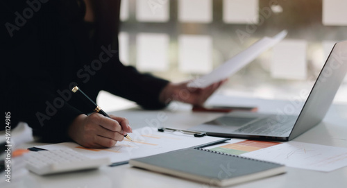 Close up of businesswoman or accountant hand holding pen working on business financial data, accountancy document and calculator at office.