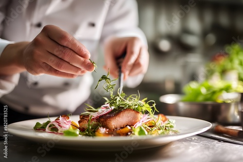 Close Up of Chef Garnishing Gourmet Plate with Fresh Herbs and Vegetables in Professional Kitchen